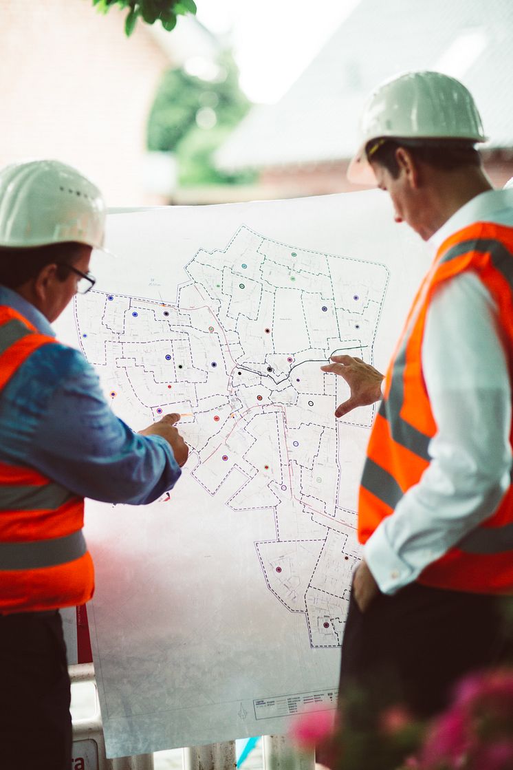 Dr. Stephan Zimmermann, Geschäftsführer Deutsche Glasfaser, läßt sich den Bauplan von Projektmanager Ivo Tanke erklären.