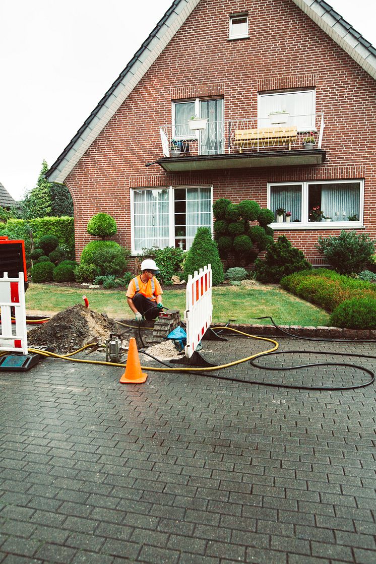 Einen so gepflegten Vorgarten sollte man nicht ruinieren: Deshalb kommt die Erdrakete zum Einsatz. die die sich unterirdisch bis kurz vor die Hauswand durchs Erdreich bohrt.