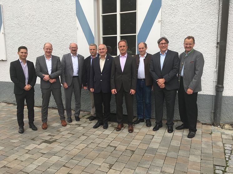 (von links nach rechts) Projektmanager Benjamin Ogles, Geschäftsführer Peter Kamphuis, Regionalleiter Martin Herkommer, alle Deutsche Glasfaser, die Bürgermeister Josef Schwäbl aus Bruck, Josef Oswald aus Glonn, Andreas Lutz aus Oberpframmern, Ernst Eberherr aus Egmating, Beratender Ingenieur Josef Ledermann und Bürgermeister Eugen Gillhuber aus Moosach.